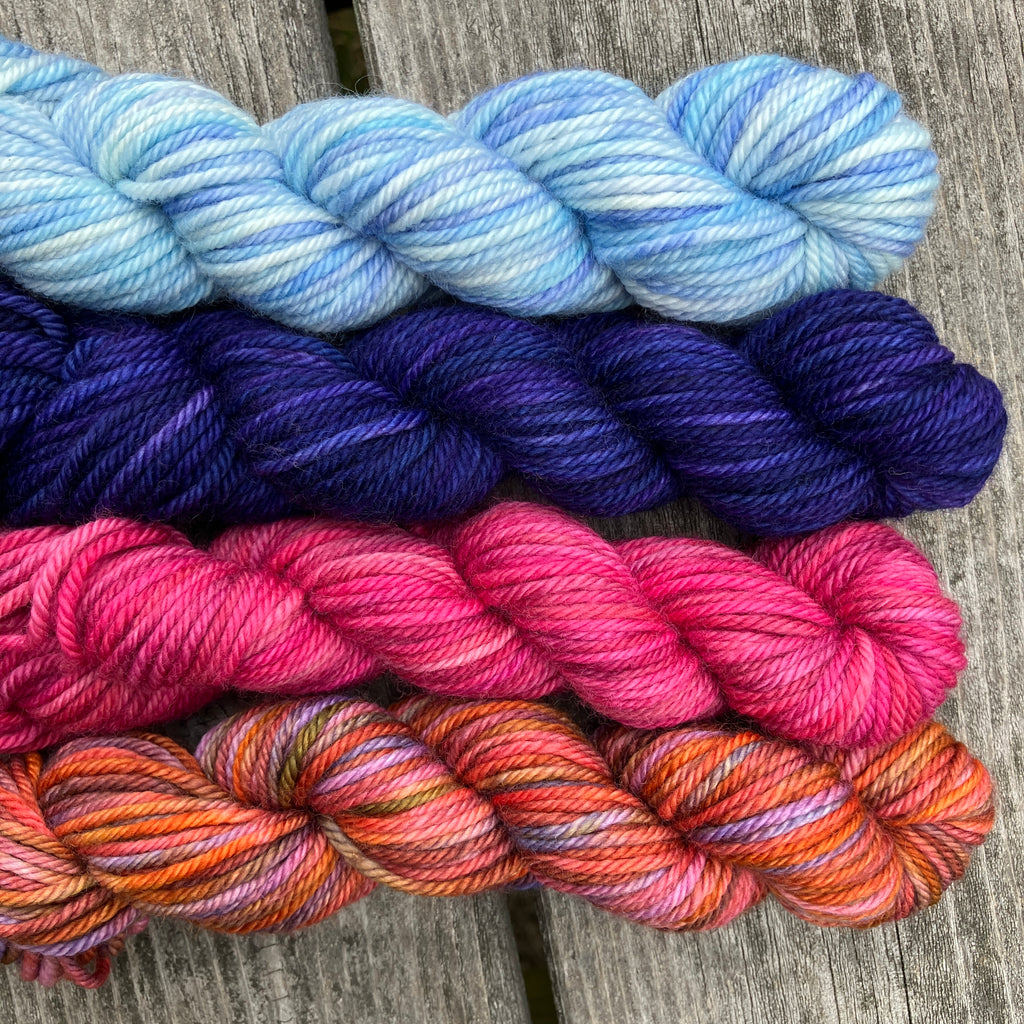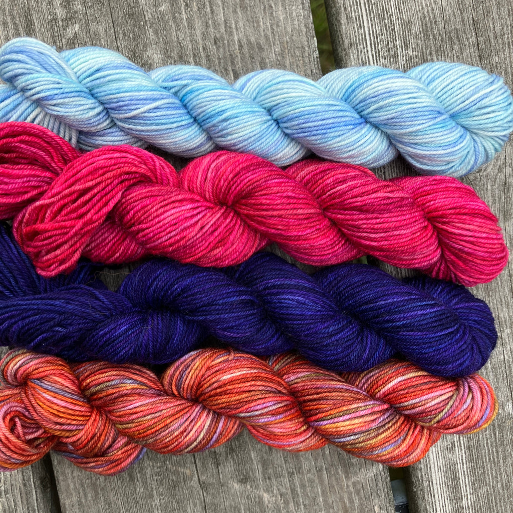 At Quill & Quiver Fiber, we believe in the power of color to inspire, and the importance of story, craft, and history to connect us to each other. Quill & Quiver Fiber Story Collections are our limited edition mini skein sets that tell stories associated with traditional crafts and the people keeping these heritage skills alive. Each collection includes four coordinating mini skeins of Quill & Quiver Fiber’s limited edition yarns hand-dyed in our barn studio in the Champlain Valley of Vermont.